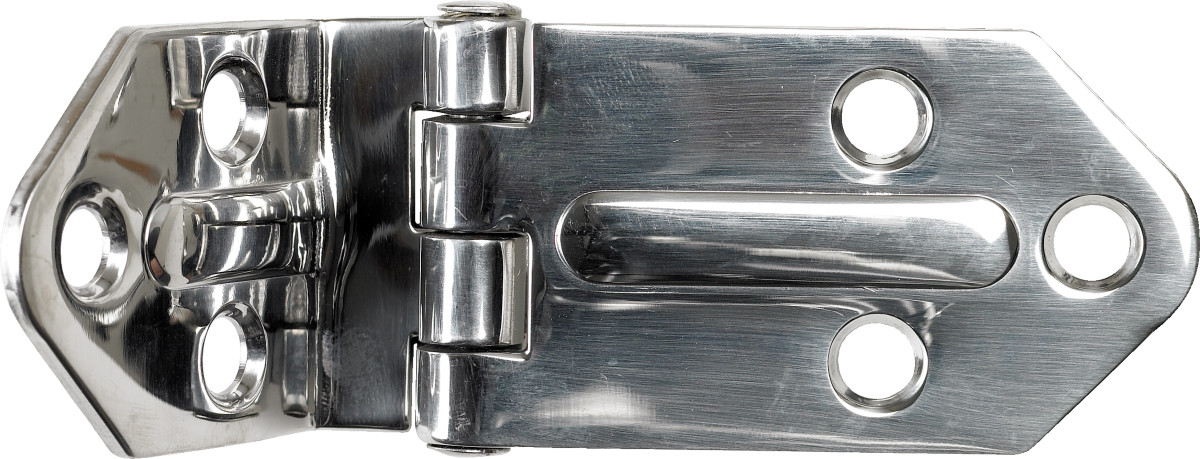 Lukehengsel i høyglanspolert syrefast stål. Hengselen måler totalt ca 116 x 40 mm, og er beregnet for 20 mm luketykkelse. Se link under for komplett målskisse.