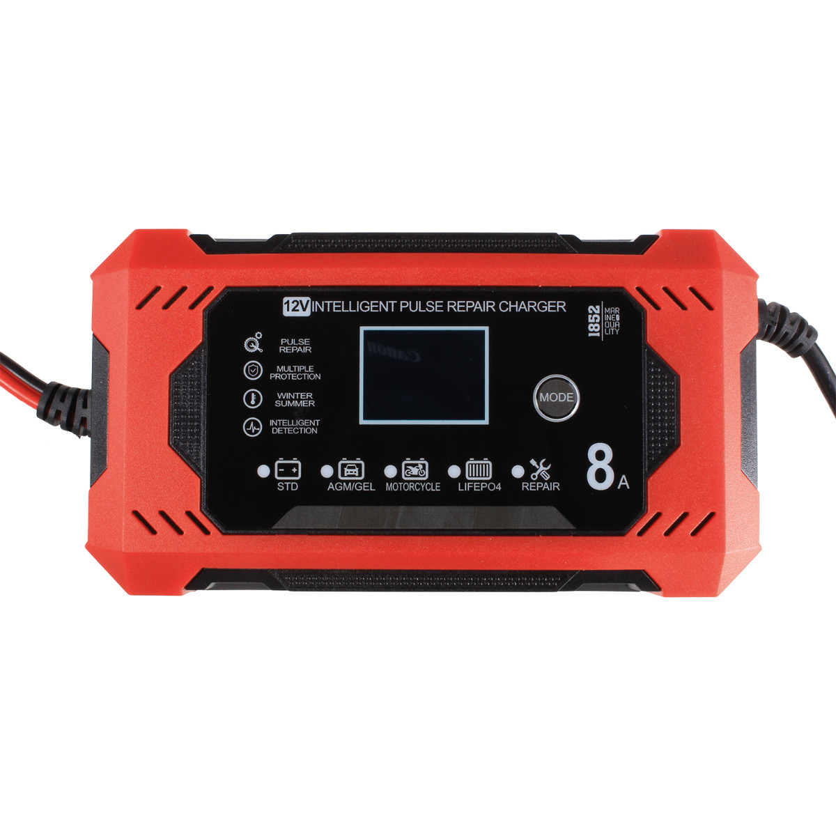 Smartlader fra 1852 for 12V-batterier med LCD-display, flere ladeprogram og innebygde sikkerhetsfunksjoner.