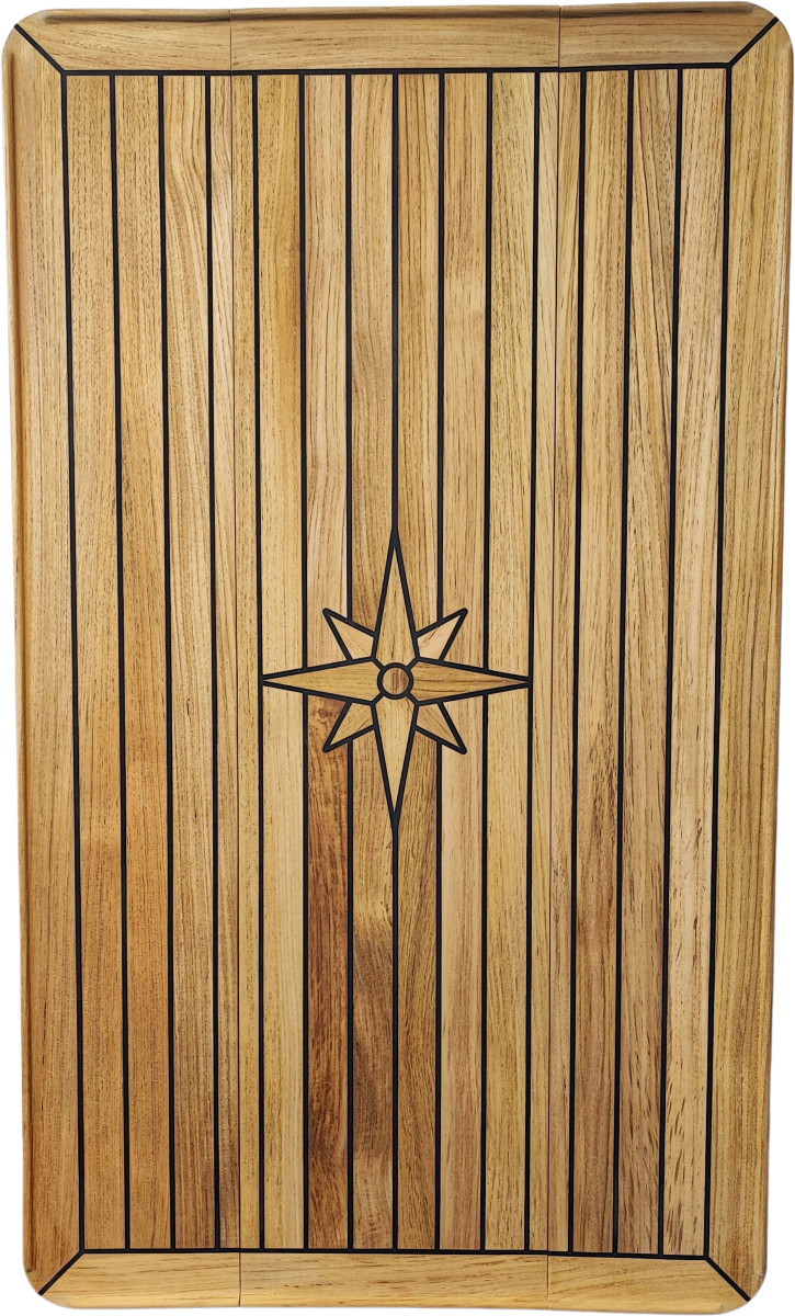 Sammenleggbart firkantet teakbord med dekorativ stjerne i senter. Natet med Sikaflex 290DC. Kjerne av plywood som er forseglet to ganger med epoxy. Rundt bordet er det en 45 mm bred ramme i teak. Teakstavene er 31 mm brede og 16 mm tykke. Bordet kan glides sammen slik at det nesten blir halvert i bredden. Glidemeiene er laget i syrefast stål.
