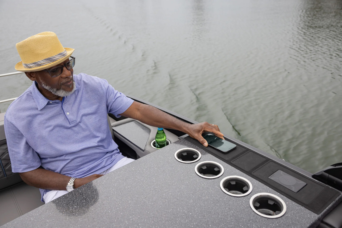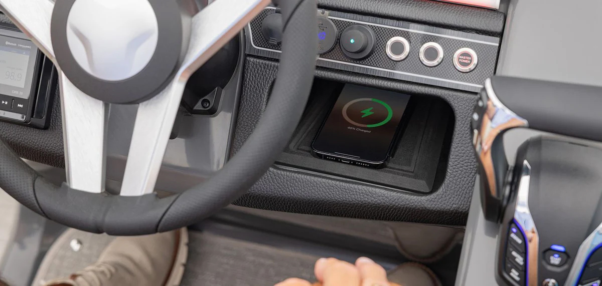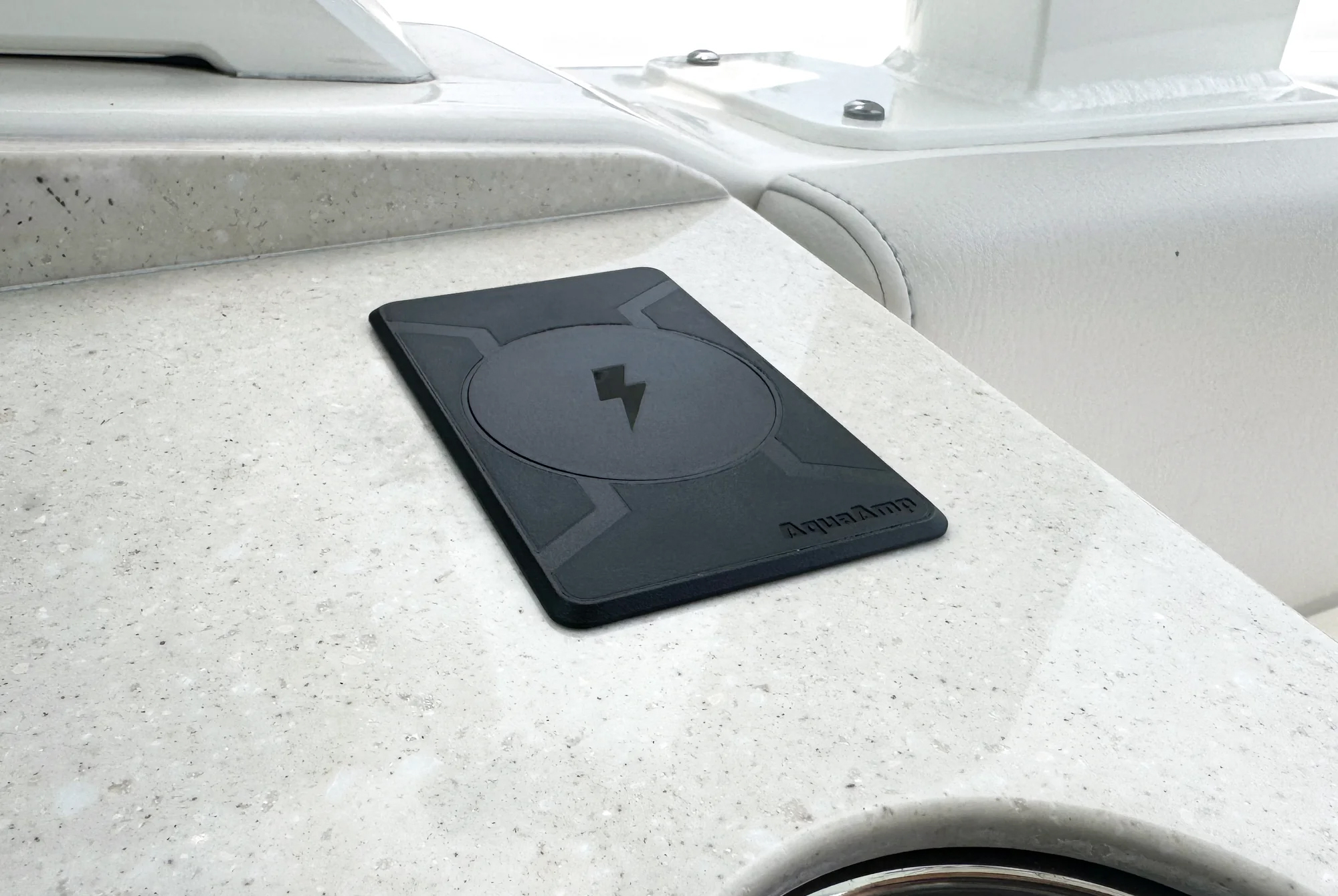 AquaAmp 200 er en rektangulær ladeplate for trådløs lading av mobiltelefon. Den er laget for innfelling, og kan lade alle telefoner som er kompatible med trådløs Qi-/Qi2-lading. Overflaten er gummiert, som gjør at telefonen ligger stabilt.Laderen er enkel å montere. Det er bare å borre et 62 mm hull der den skal stå, plassere laderen over hullet, og koble til 12V strøm. Ladeplaten kommer ferdig med 3M dobbeltsidig tape. Ønsker du en ekstra sterk montering, kan du kjøpe med låsering (prod.nr. 1011364). Det er også mulig å koble til en statuslampe, som viser om telefonen lader eller ikke (prod.nr. 1011363).