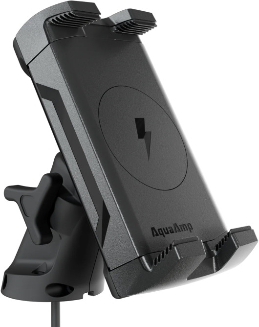 AquaAmp 500 er en mobilholder med trådløs lading. Den kan lade alle telefoner som er kompatible med trådløs Qi-/Qi2-lading. I tillegg til den fjærbelastede klemmen, har holderen en magnet som holder kompatible telefoner på plass. Den er også kompatibel med Apple MagSafe og Google PixelSnap.Ønsker du statuslampe, som viser om telefonen lader eller ikke, kan du kjøpe med AquaAmp Status LED (prod.nr. 1011363).