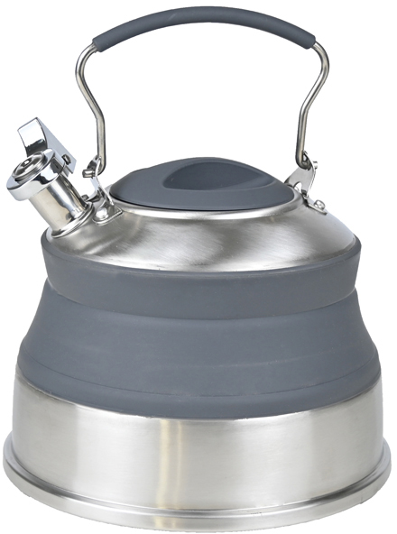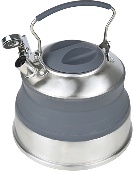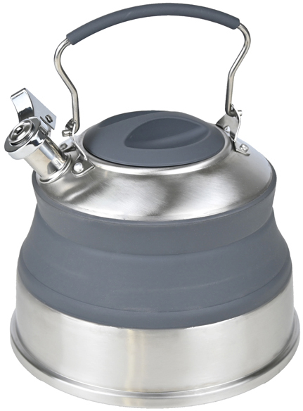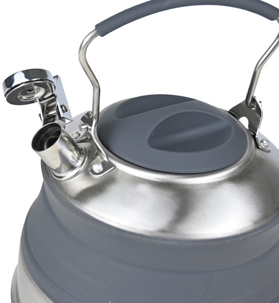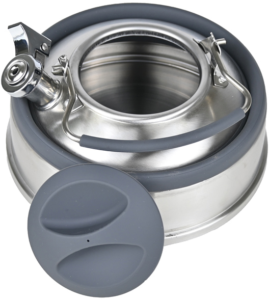 Sammenleggbar kjele som plystrer når det koker! Kjelen fra 1852 har rustfritt stål i bunn og topp, og foldbar varmebestandig silikon i mellomdelen. Dette gjør den svært oppbevaringsvennlig. Sammenbrettet bygger den bare 9 cm i høyden, som er vesentlig mindre enn en tilsvarende vanlig kjele. Vekten er på bare 550 gram!Kjelen leveres med lokk. Alle materialer er BPA-frie og næringsmiddelgodkjente. Den kan brukes på alle koketopper utenom induksjon.
