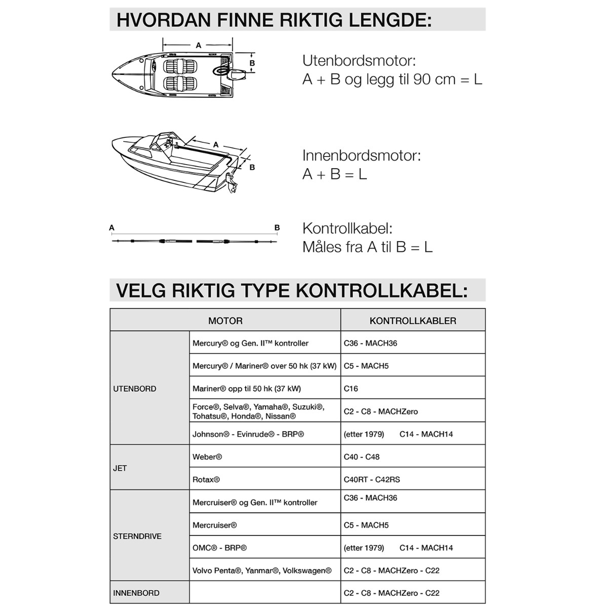 Standardkontrollkabel C14 til Johnson, Evinrude og OMC motorer fra 1979 og fremover.Spesifikasjoner: